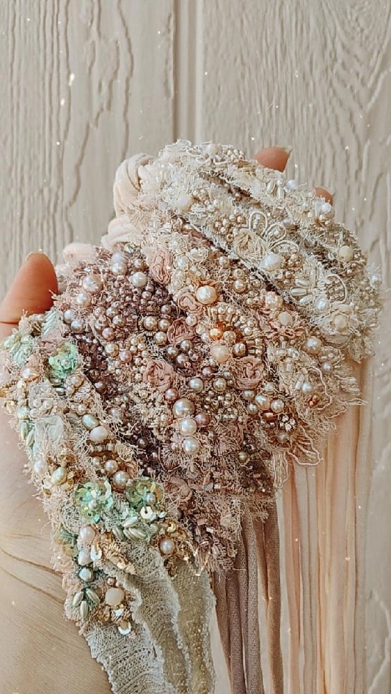 Beautiful dainty handbeaded Tiebacks with tiny pearls that would work for nb and sitter. Set on jersey fabric on the back for best comfort and fit.