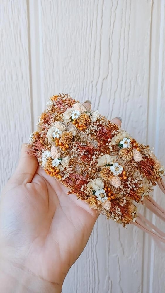 Beautiful halo made with real preserved flowers. Nb but would work for sitters also. Set on jersey fabric for better fit and comfort.