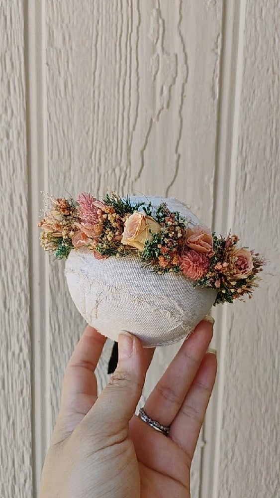 Beautiful halos are a combination of preserved and dried flowers. Set on jersey fabric for better comfort and with long ties on the back. Please allow 3 to 10 business days for shipping and handling.