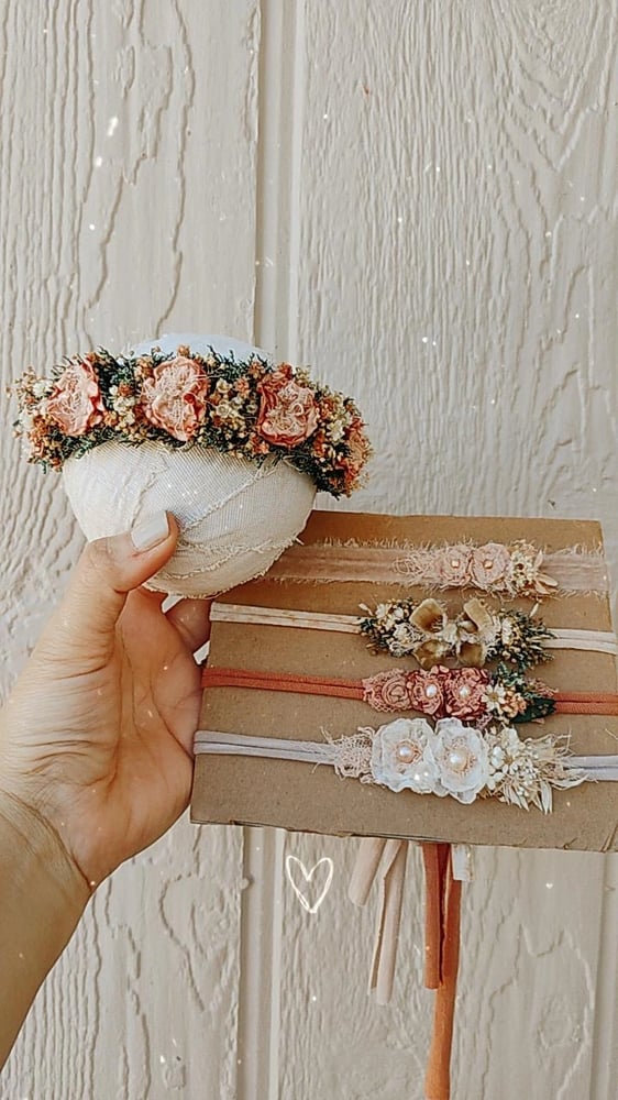 Beautiful set of halo and 4 tiebacks made with preserved and artificial flowers. Nb but would work for sitters also. Set on jersey fabric for better fit and comfort.