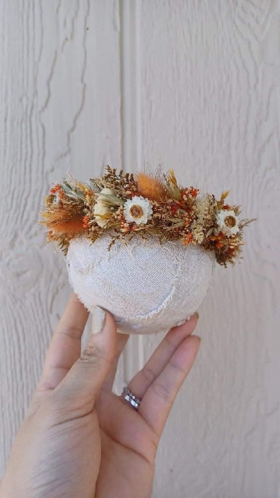 This halo is a beautiful combination of preserved and dried flowers. Set on jersey fabric for better comfort and with long ties on the back. Please allow 3 to 15 business days for shipping and handling.
